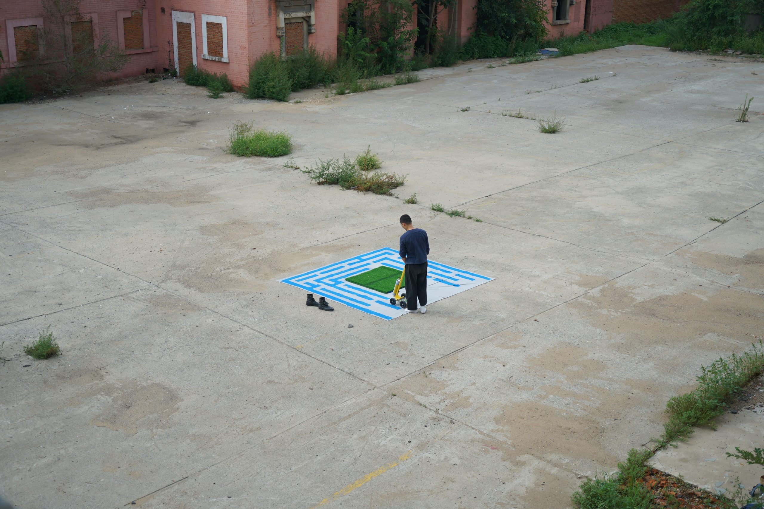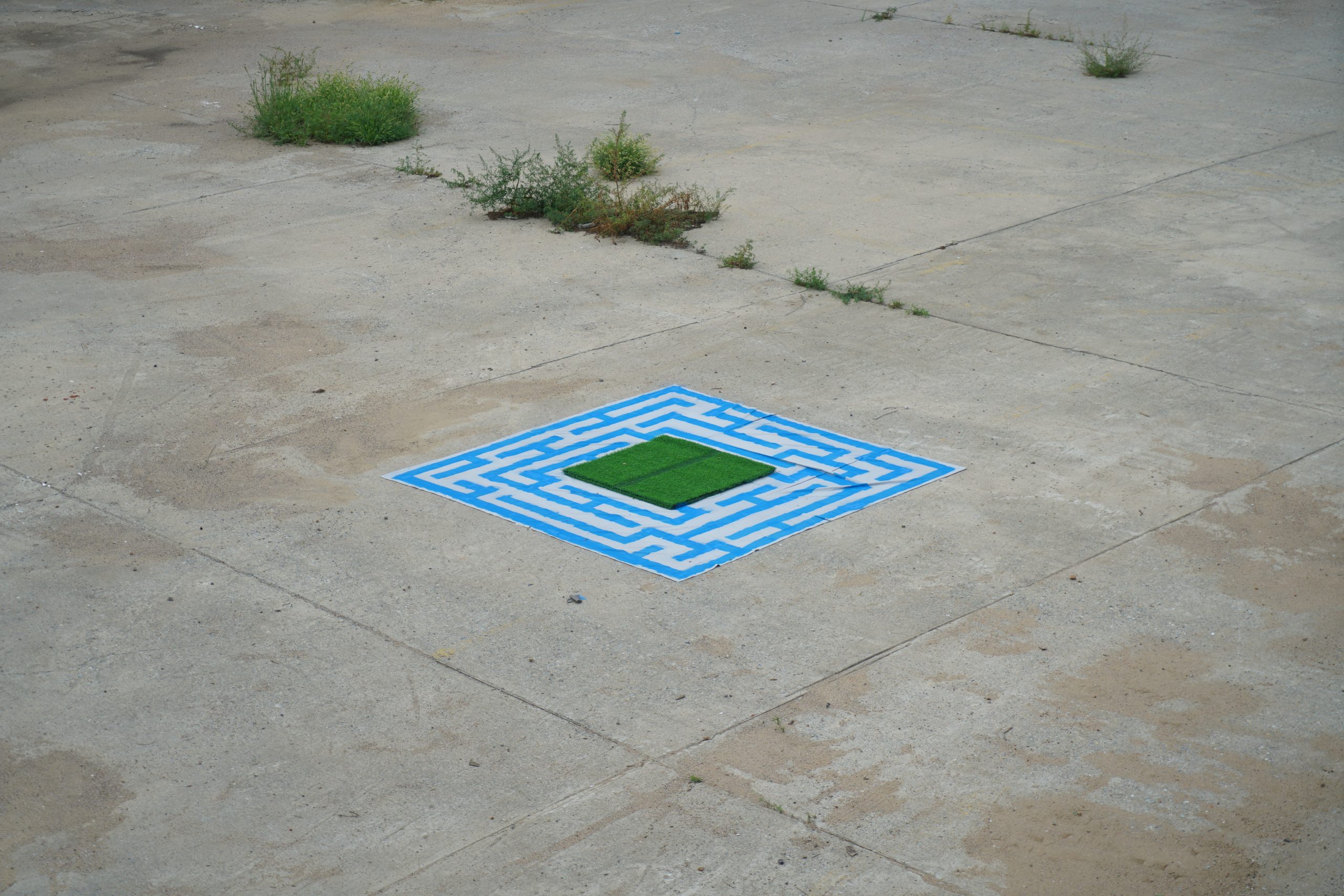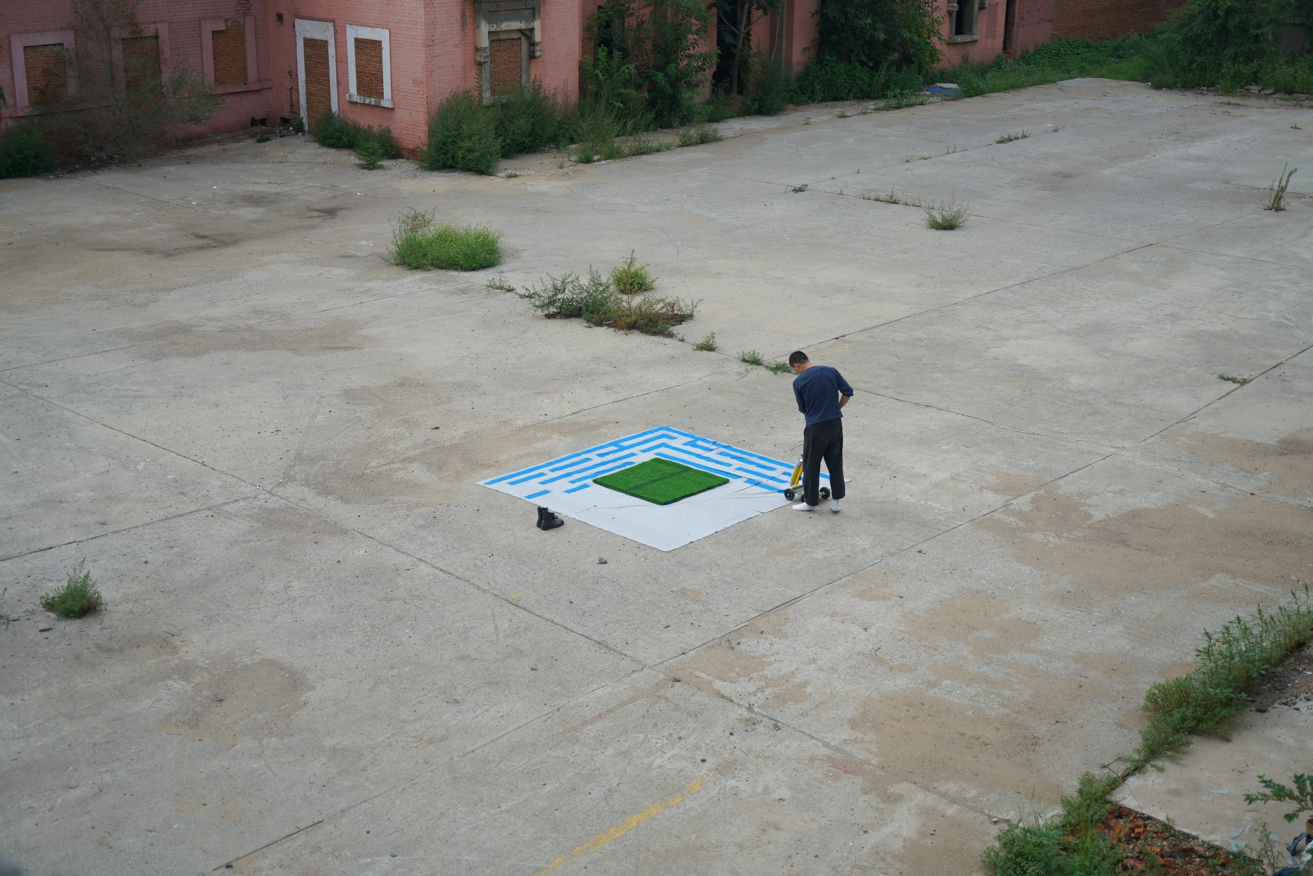I used a road marking machine to fill the space with labyrinth pattern in the defined space. Inside the boundary is the useful space, and outside the boundary is the waste land. From shapeless to tangible, 2 dimensional to 3 dimensional, the original of land is transformed by the process of civilisation.
