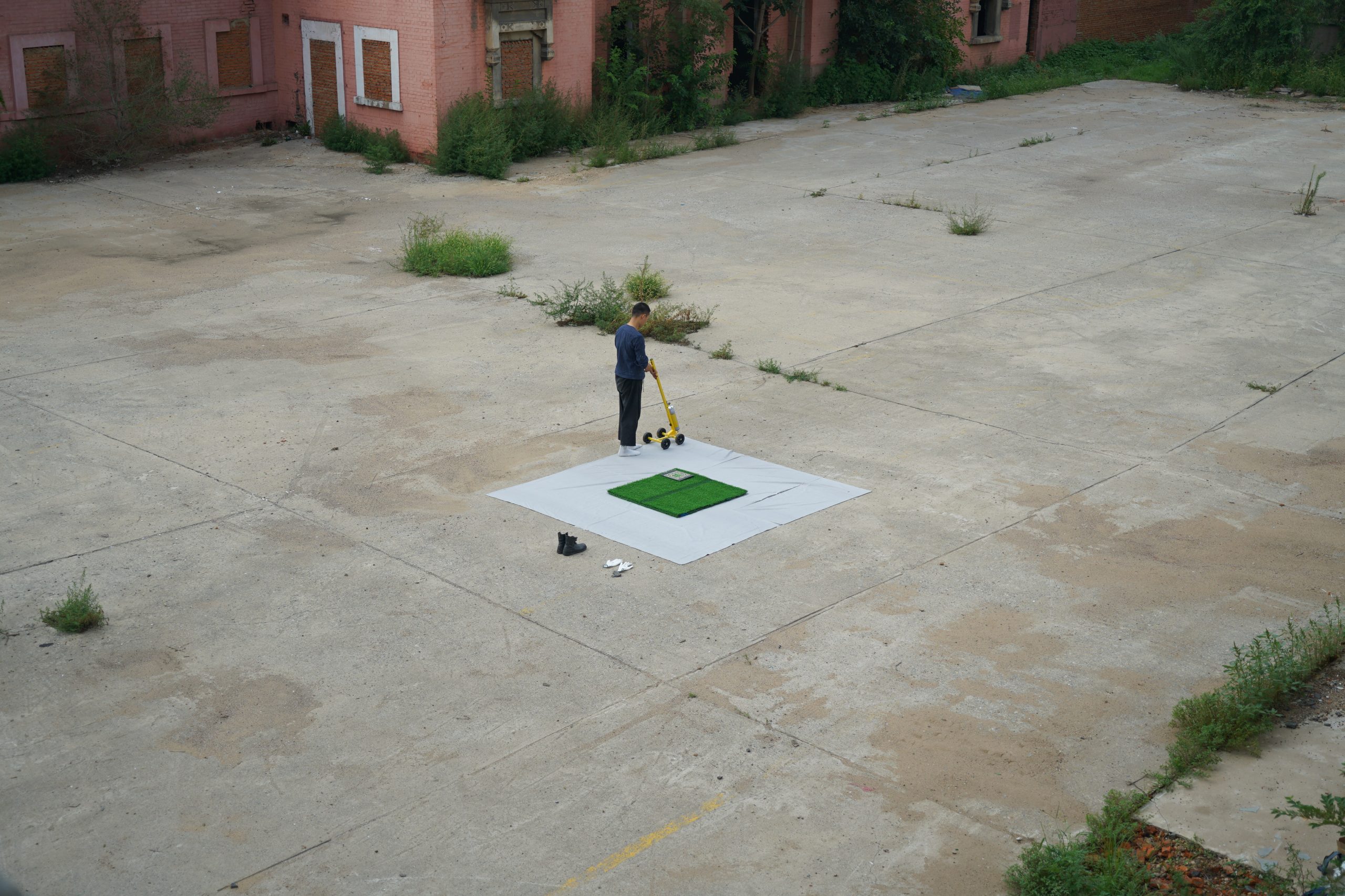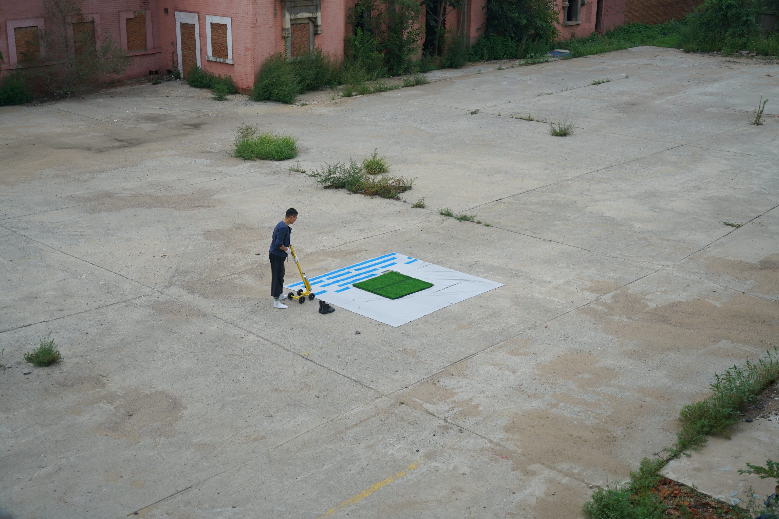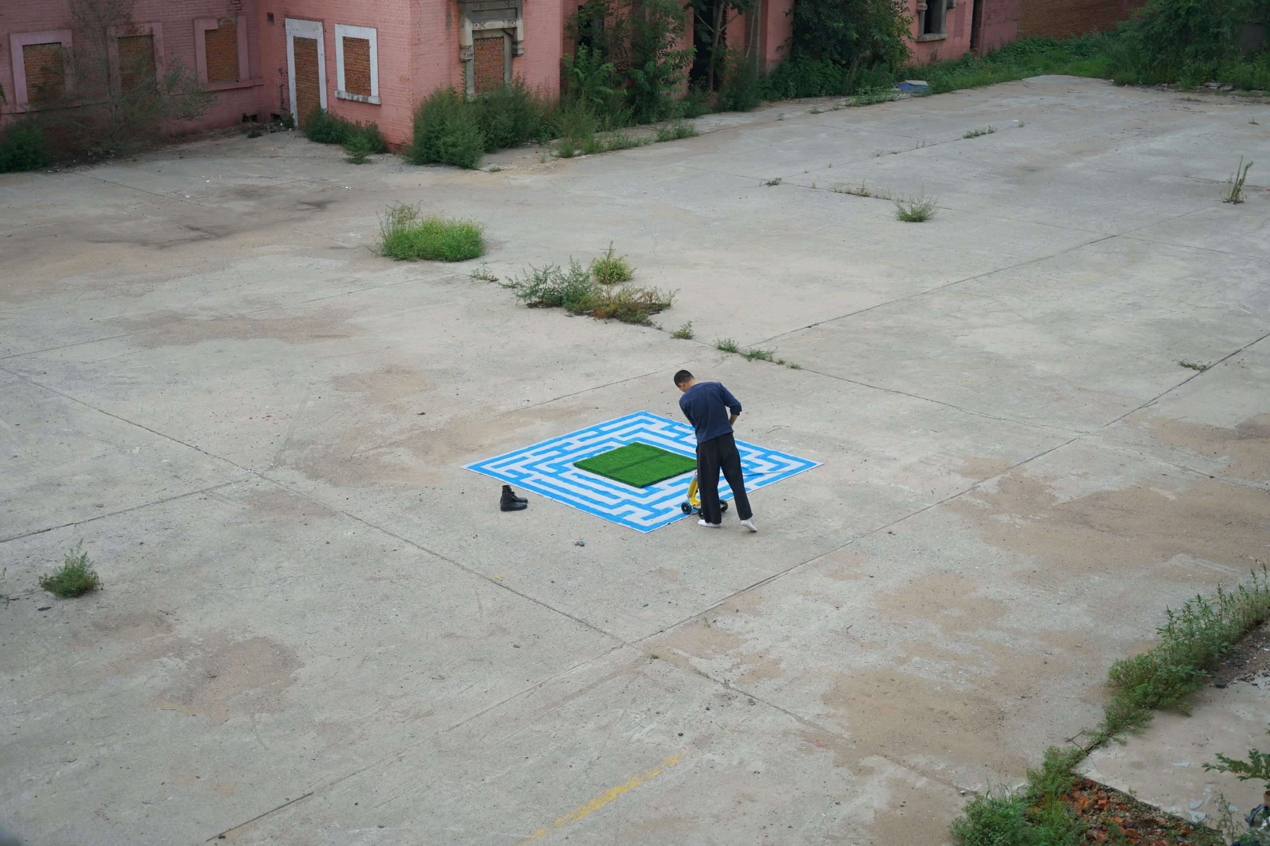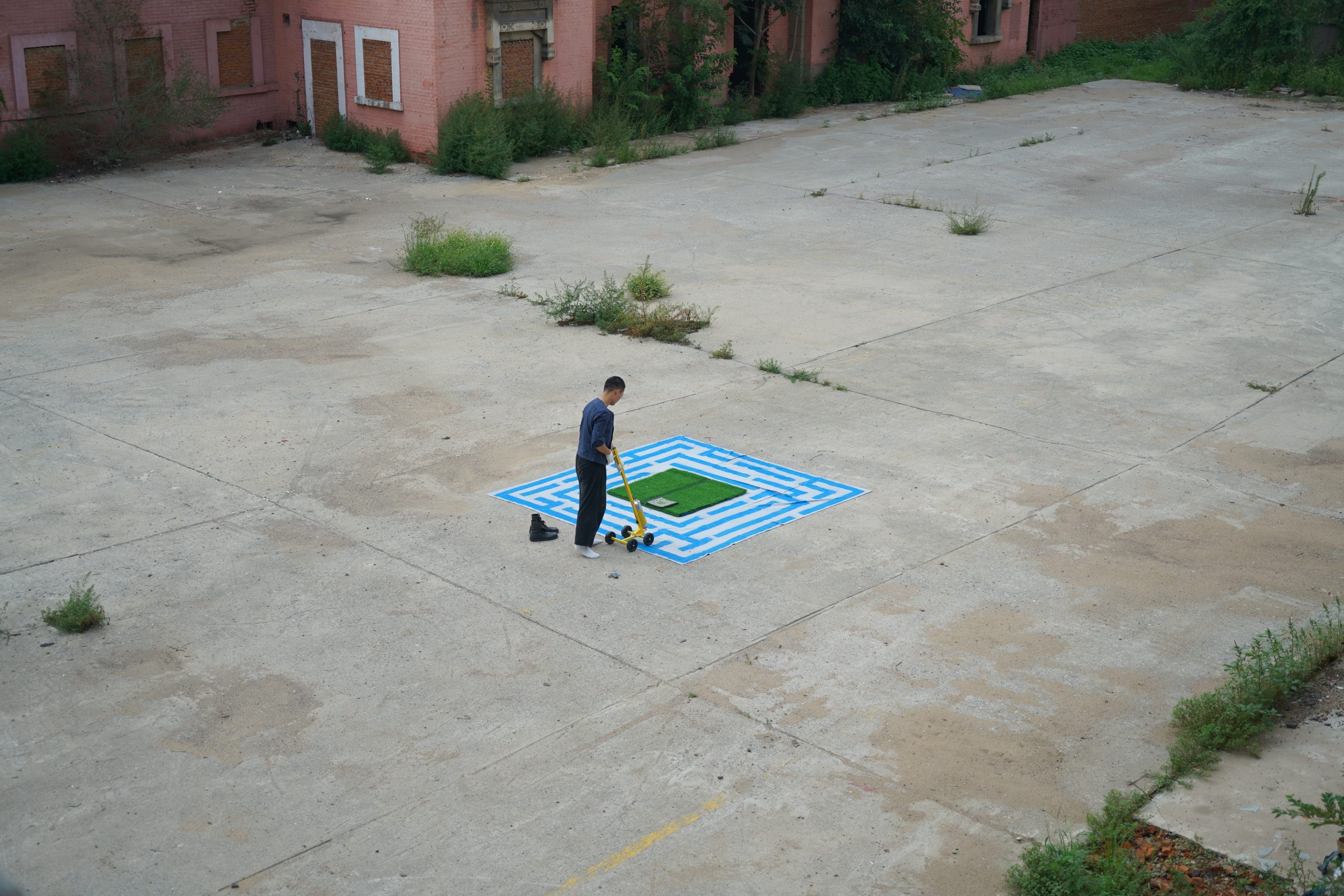 I used a road marking machine to fill the space with labyrinth pattern in the defined space. Inside the boundary is the useful space, and outside the boundary is the waste land. From shapeless to tangible, 2 dimensional to 3 dimensional, the original of land is transformed by the process of civilisation.